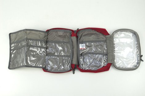 Вместительная походная аптечка (без содержимого). Аптечка удобно раскладывается, имеет множество кармашков внутри, молнию по периметру и петли для крепления на пояс.