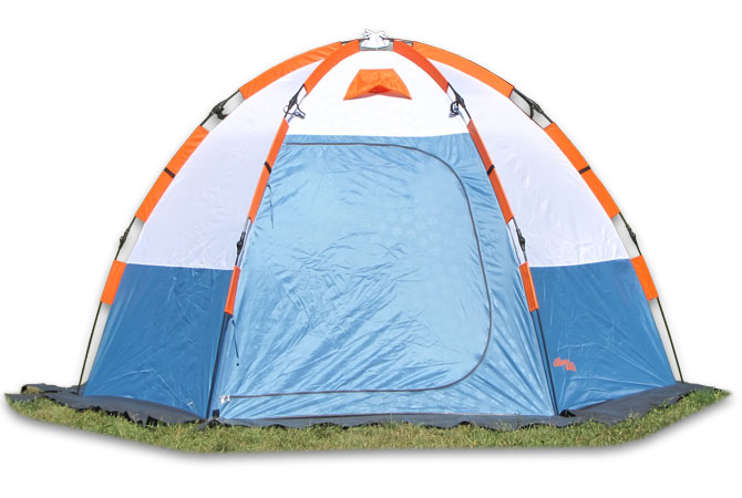 Быстросборная палатка разработана специально для рыбалки со льда и рассчитана на 4-5 рыболовов. Конфигурация пола представляет собой шестигранник. Такая конструкция палатки наиболее ветроустойчивая, при сильных порывах ветра дуги не "скручиваются" и стенки тента практически не "вдуваются" внутрь. Палатка изготовлена из современных материалов. В комплекте идут 6 дополнительных ветровых оттяжек, ввертышей в комплекте нет. По низу палатки пришита широкая юбка (20см), которую, при установке палатки, необходимо присыпать снегом для лучшей ветровой устойчивости и защиты. За счет белого цвета материала купола, даже в пасмурный день в палатке будет светло и не потребуется использовать дополнительное освещение.