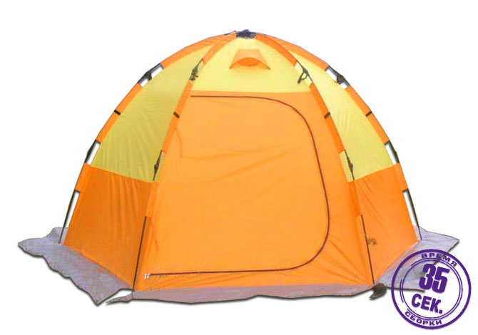 Быстросборная палатка специально разработана для рыбалки со льда и рассчитана на 4-5 рыболовов. Конфигурация пола представляет собой шестигранник. Такая конструкция палатки наиболее ветроустойчивая, при сильных порывах ветра дуги не «скручиваются» и стенки тента практически не «вдуваются» внутрь. Палатка изготовлена из современных материалов. В комплекте идут 6 дополнительных ветровых оттяжек, ввертышей в комплекте нет. По низу палатки пришита широкая юбка (20см), которую при установки палатки, необходимо присыпать снегом для лучшей ветровой устойчивости и защиты. За счет желто/оранжевого цвета материалов, даже в пасмурный день в палатке светло и не требуется использования дополнительного освещения.