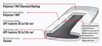 Размер: 195 х 100 х 35см. Размер в чехле: 46/36 х 28см. Утеплитель: APF Isoterm 3D300 2 x 150 г/м2. t-комфорта: +5 С. t-предела комфорта: 0 С. t-экстрима: -16 С.