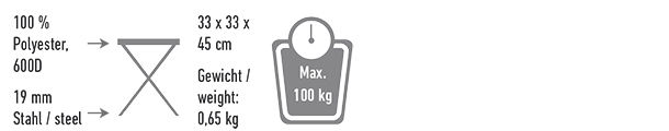 Каркас: сталь 19 мм.Макс. нагрузка: 100.0 кг.Вес: 0.65 кг.Размер: 33 x 33 x 45 см.Материал: полиэстер; сталь.