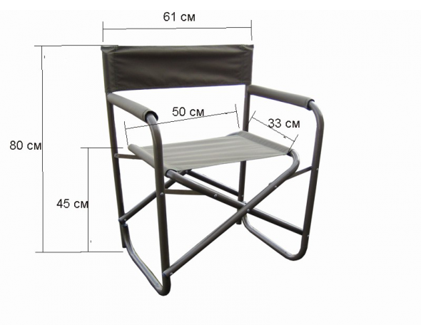 Стул складной изготовлен из стальной труба 25 мм, покрыт порошковой краской.Ткань - плотностью 600 D, в два сложения.Нагрузка - до 200 кг.Вес кресла - 4.6 кг.