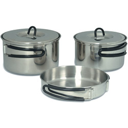 Походный кухонный набор. Одна сковородка, две кастрюли. Легко чистится и имеет привлекательный внешний вид даже после длительной эксплуатации.Характеристики: Материал: Stainless Steel 18/8.Набор посуды: 3 предмета.Кастрюля 1: 16 x 9 cm / 285g / 1,3l.Кастрюля 2: 14,5 x 8 cm / 235g / 0,9l.Сковородка: 16 x 3,5 cm / 160g.