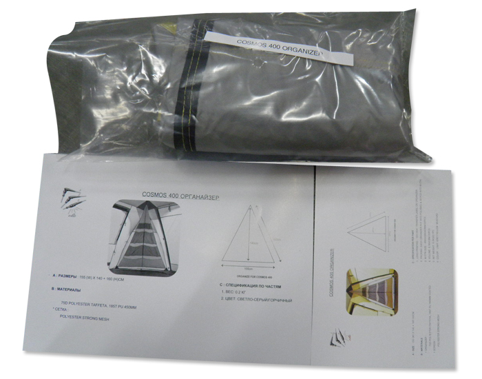 Крепится органайзер так же как и внутренняя палатка при помощи клевант в пластиковые кольца, вшитые в шов в углах шатра. За счет использования сетки эта кострукция сама по себе ничего не весит и, в то же время, вы можете видеть, что у вас лежит в кармашках.