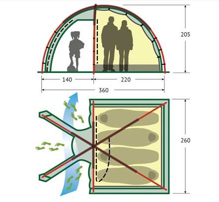Эффективная система вентиляции состоит из одного вентиляционного окна с ветровым клапаном, расположенного в верхней точке купола, и одного торцевого окна с внешней шторкой на молнии.