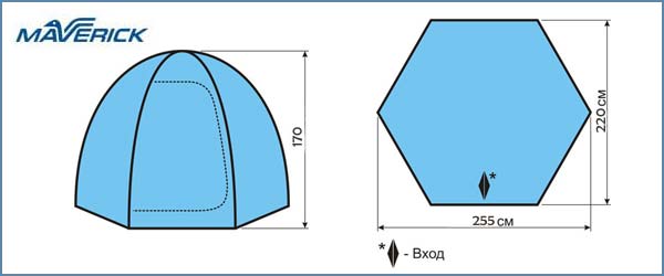 Быстро сборная палатка Маверик Ice 4 специально разработана для рыбалки со льда и рассчитана на 3 рыболова. Конфигурация пола представляет собой шестиугольник. Палатка изготовлена из прочных современных материалов и комплектуется шпильками-саморезами длиной 19 сантиметров (12шт). Так же в комплекте четыре дополнительные ветровые оттяжки. По низу палатки Maverick Ice пришита широкая (20 см) юбка. В целом палатка Maverick Ice 4 представляет собой устойчивую конструкцию, способную выдержать достаточно сильные ветровые нагрузки. За счет желто/оранжевого цвета материалов, даже в пасмурный день в палатка светло и не требуется использования дополнительного освещения.