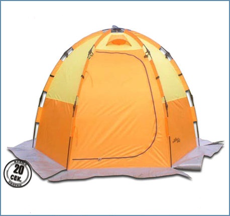 Быстросборная палатка разработана специально для рыбалки со льда и рассчитана на одного-двух рыболовов. Конфигурация пола представляет собой шестигранник. Такая конструкция палатки наиболее ветроустойчивая, при сильных порывах ветра дуги не «скручиваются» и стенки тента практически не «вдуваются» внутрь. Палатка изготовлена из современных материалов. В комплекте идут 6 дополнительных ветровых оттяжек, ввертышей в комплекте нет. По низу палатки пришита широкая юбка (20см), которую, при установке палатки, необходимо присыпать снегом для лучшей ветровой устойчивости и защиты. За счет белого цвета материала купола, даже в пасмурный день в палатке будет светло и не потребуется использовать дополнительное освещение.