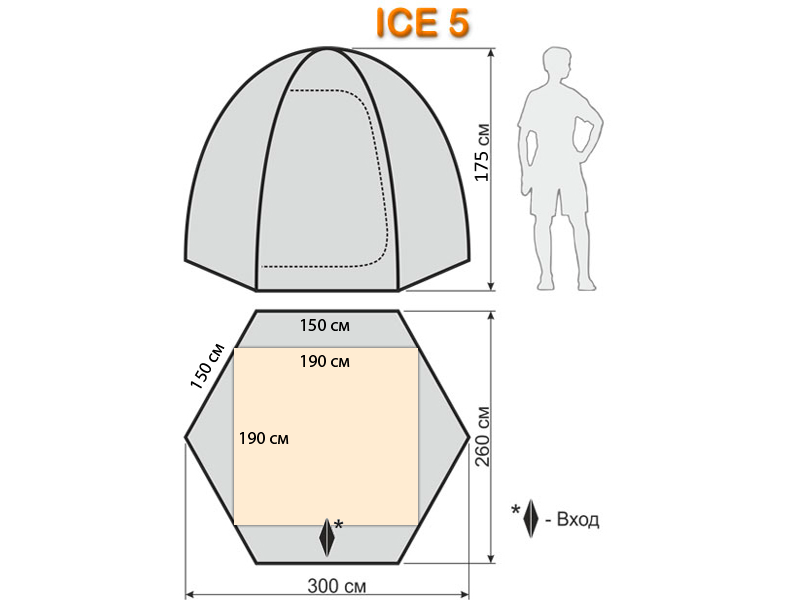Быстросборная палатка специально разработана для рыбалки со льда и рассчитана на 4-5 рыболовов. Конфигурация пола представляет собой шестигранник. Такая конструкция палатки наиболее ветроустойчивая, при сильных порывах ветра дуги не «скручиваются» и стенки тента практически не «вдуваются» внутрь. Палатка изготовлена из современных материалов. В комплекте идут 6 дополнительных ветровых оттяжек, ввертышей в комплекте нет. По низу палатки пришита широкая юбка (20см), которую при установки палатки, необходимо присыпать снегом для лучшей ветровой устойчивости и защиты. За счет желто/оранжевого цвета материалов, даже в пасмурный день в палатке светло и не требуется использования дополнительного освещения.