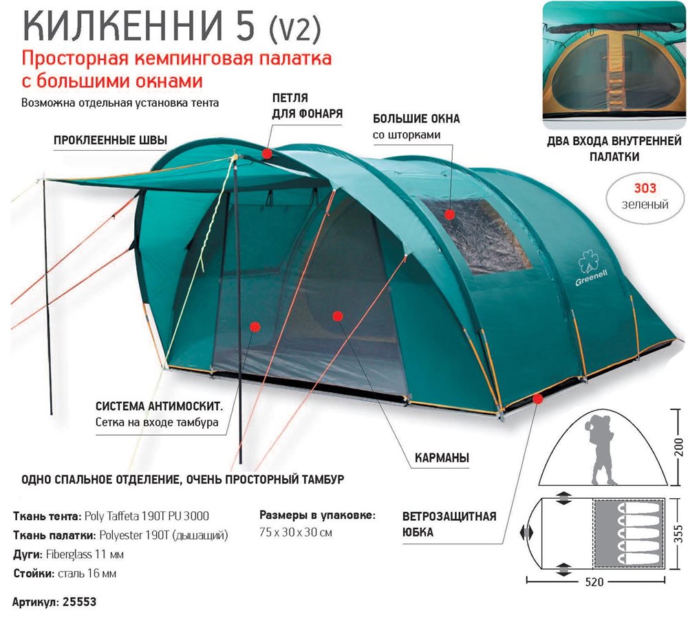Просторная кемпинговая палатка с большими окнами.Особенности: Одно спальное отделение. Очень просторный тамбур. Большие окна со шторками. Возможна отдельная установка тента. Проклеенные швы тента. Противомоскитная сетка. Карманы. Подвесная полка. Ветрозащитная юбка. Прозрачные окна. Технические характеристики:Материалы каркаса: Fiberglass 11 mm. Конструкция: Дуговые. Ткань тента: Poly Taffeta 190T PU 3000. Ткань пола: Tarpauling. Ткань палатки: Poly Taffeta 190T дышащий. Стойки: Сталь.Вес: 14,8 кг. Водостойкость тента: 3 000 мм/в.ст. Габаритные размеры сумки: 75 х 30 х 30 см.