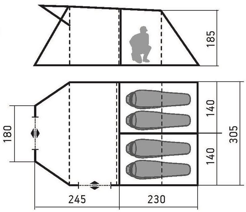 Технические характеристики: Количество мест: 4 Количество входов: 2 Материалы каркаса: Fiberglass 7/9,5/11 мм Ткань тента: Poly Taffeta 190T PU 4000 Ткань пола: Tarpauling Ткань палатки: Polyester 190T дышащий Вес: 14 кг Габаритысумки: 70 х 28 х 28 см