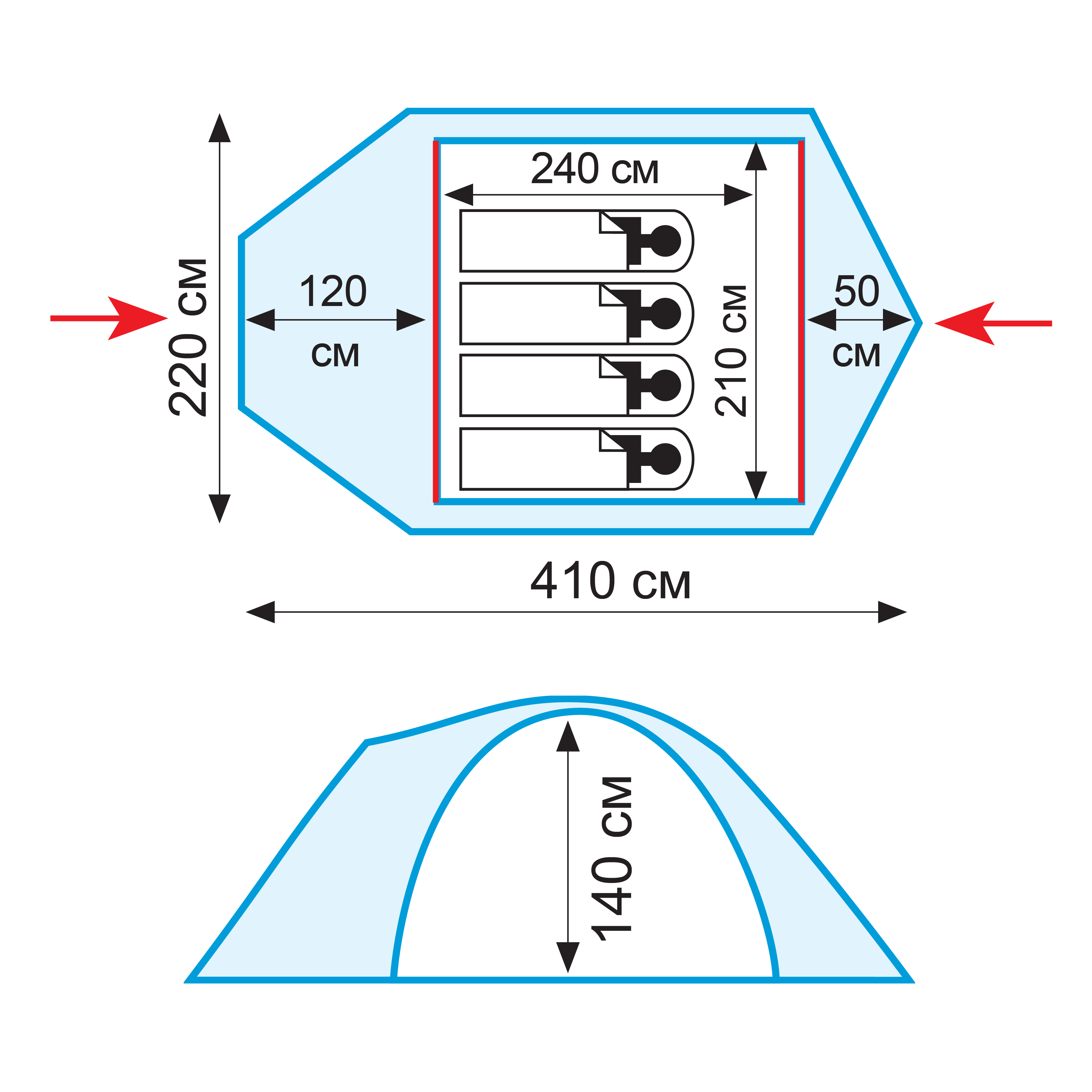 Количество входов: 2. Вес (кг.): 4,9. Каркас: Алюминий, сплав 7006, диаметр 8,5 мм. Водостойкость тента (в мм.водяного столба): 8000. Материал Тент: 100% полиэстер 75D/190T. Водостойкость дна (в мм.водяного столба): 10000. Материал внутренняя палатка: 100% дышащий полиэстер RipStop. Материал Дно: 100% полиэстер 75D/190T. Размер: 220 х 410 см. Количество тамбуров: 1*120 +1* 50 см. Высота: 140 см. Количество мест: 4. Проклейка швов: да. Устойчивость к ультрафиолетовому излучению: да. Москитные сетки на входе в спальные отделения: да. Комплектуется: 3-гранными колышками, ремкомплект, оттяжки. Снежная юбка: да. Светоотражающие элементы: да. Материал: 100% Полиэстер. Количество слоев: 2.