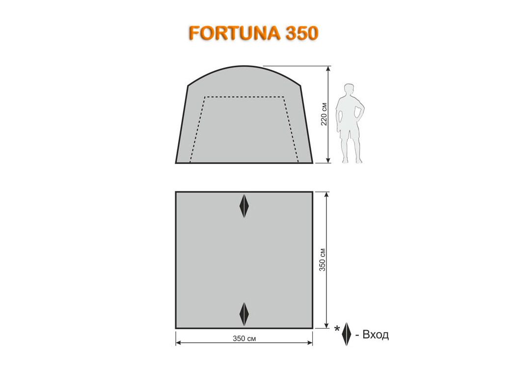 Шатер-тент Fortuna 350 - новая серия 2011 года от именитой линейки Maverick. Инновационная система Rapid POLE позволяет установить тент за 1 минуту, несмотря на его внушительные габариты. Fortuna 350 имеет в своем основании квадратную форму. По периметру отстрочен широкой юбкой, способствующей отводу дождевой воды и препятствующей попаданию внутрь тента маскитов. Вентиляция в крыше позволяет готовить внутри и эффективно удалять продукты горения, отверстия оборудованы москитной сеткой. Вес составляет 11 кг, цвет - зеленый/тепло серый/желто-горчичный/оранжевый. Тент рассчитан на 6 человек.