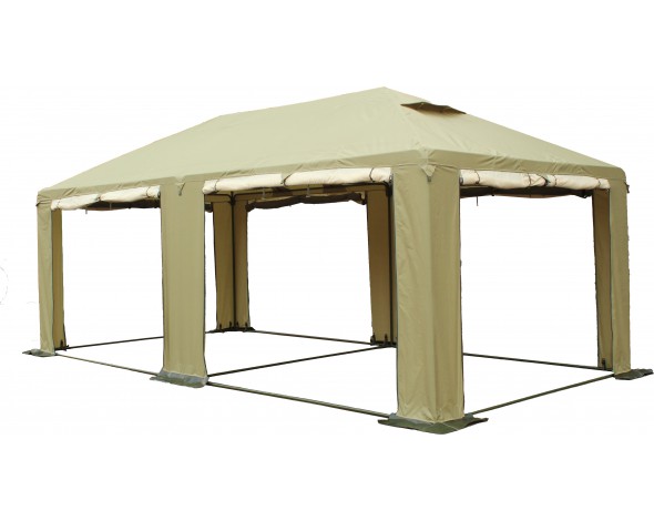 Характеристики: Площадь - 18 кв.м. Размер: 6,0х3,0 м Изготовлен из стальной трубы Ø 25 и 28 мм, имеет нижнее основание и покрыт порошковой краской. Нижнее основание и верхняя обвязка служат для повышения прочности конструкции. Для фиксации элементов каркаса между собой используются кнопки-защёлки. Соединительные элементы (крестовины) выполнены из стальной трубы увеличенной толщины. Тент имеет 8 прочных петель-оттяжек для повышения ветроустойчивости. Ткань oxford 240D PU 2000 (водостойкость 2000 мм водяного столба). Швы крыши проклеены. Цвет: Камуфляж в комплект шатра входит: глухие стенки (6 шт.) — стенки с окнами (4 шт.)— стенки из антимоскитной сетки (6 шт.)