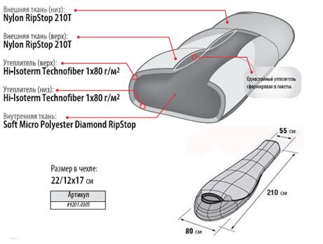 Характеристики: Вес: 0.9 кг. Т комфорта: 14 C. Т предела комфорта: 9 C. Т экстрима: -1 C. Размер: 88x210x55 см. Сезонность: лето. Утеплитель: Hi-Isoterm Technofiber.