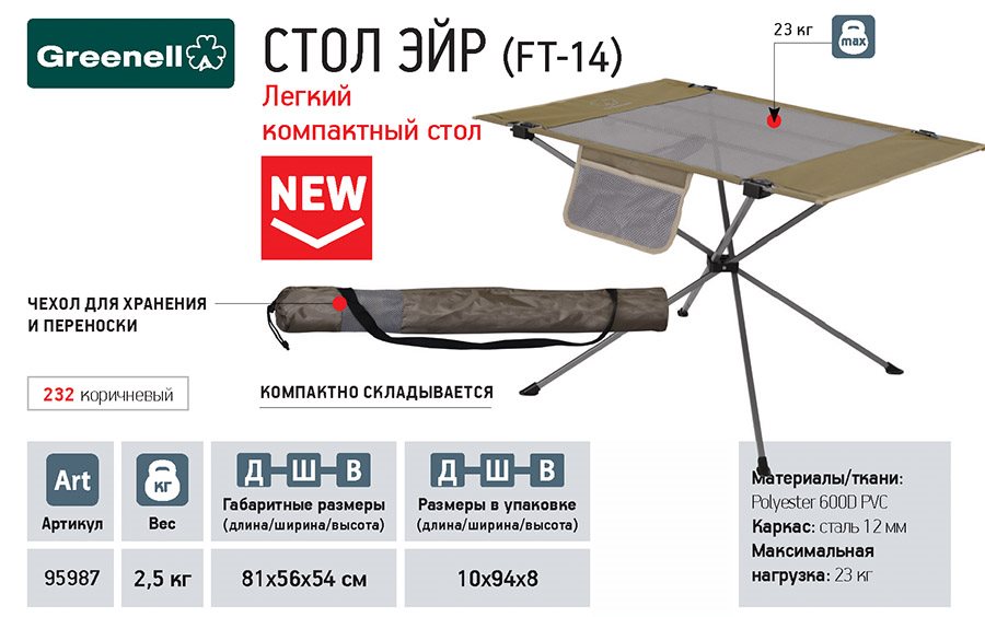 Впечатляющая компактность в сложенном виде и простота сборки позволит столу найти постоянное место в сумке снаражения или в багажнике.Технические характеристики:Материал: Polyester 600D PVCКаркас: сталь 12 ммВес (кг): 2,5Размеры: 81x56x53 смМаксимальная нагрузка (кг): 23Чехол