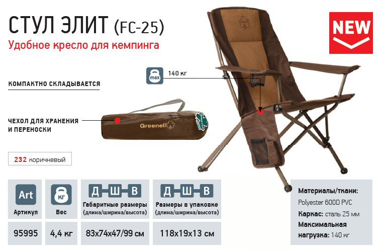 Технические характеристики: Материал: Polyester 600D PVC Каркас: сталь 25 мм Вес (кг): 4,4 Размеры: 83х74х47/99 см Максимальная нагрузка (кг): 140 Размеры в сложенном виде: 118х19х13 см Чехол