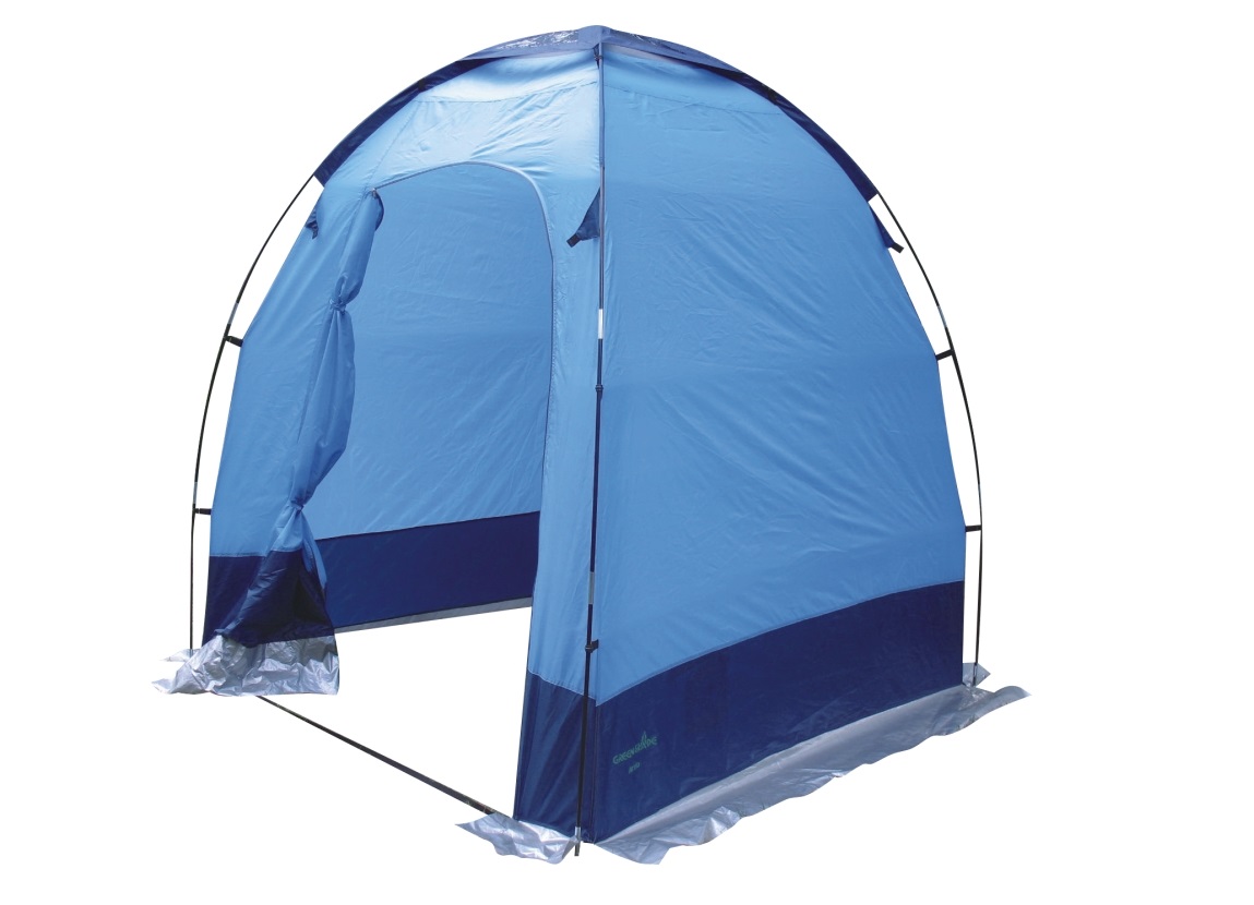 Этот тент для душа можно очень просто установить буквально за 3-5 минут. Вентиляция осуществляется через вентиляционное окно из москитной сетки на куполе палатки, которое сверху прикрывается от дождя водонепроницаемым полотном. Дверь закрывается на молнию. Колечко на куполе тента для биотуалета Вы можете использовать для подвески кемпингового фонаря, в особенности удобно подвешивать фонарь с помощью карабина.