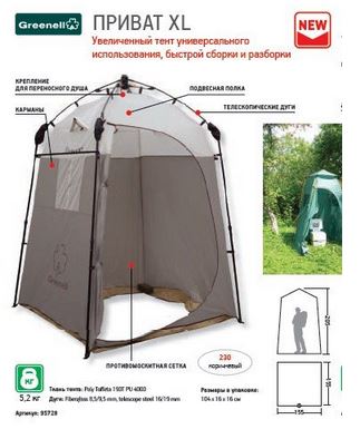 Тент с полуавтоматическим каркасом и телескопическими дугами. Не требует большой площадки для установки. Можно использоваться как полноценный душ, туалет и место для хранения. Окошко с сеткой. Крепление для переносного душа. Один вход. Перекладина для полотенца.