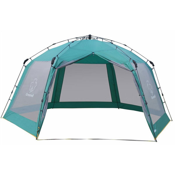 Каркасный шатер с большим внутренним пространством и одним входом. Стенки из антимоскитной сетки. Легко ставится одним человеком за 1 минуту. Облегченная регулировка оттяжек со световозвращающей нитью.