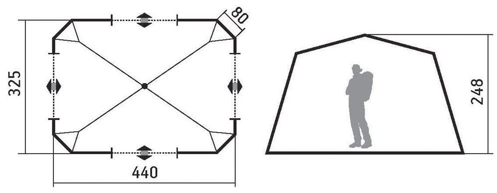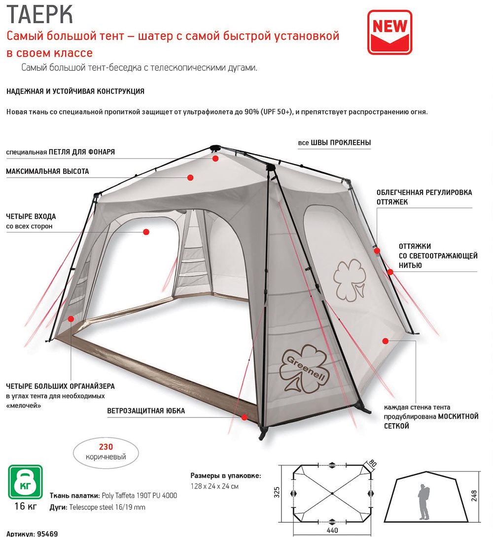 Надежная и устойчивая конструкция. Четыре входа со всех сторон. Максимальная высота. Каждая стенка тента продублирована москитной сеткой. Четыре больших органайзера в углах тента для необходимых "мелочей". Новая ткань со специальной пропиткой защищет от ультрафиолета до 90% (UPF 50+), и препятствует распространению огня. Все швы проклеены. Специальная петля для фонаря. Облегченная регулировка оттяжек. Оттяжки со светоотражающей нитью.